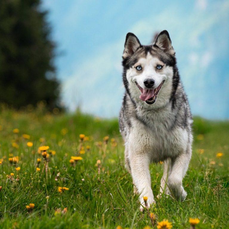 Un chien heureux qui gambade gaiement dans une prairie verdoyante lors d'une belle cani rando au Lac Bénit!