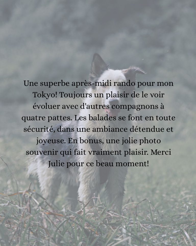 La randonnée dure en moyenne 3 à 5 heures, avec un rythme adapté au groupe. Nous alternons marche active, pauses, exploration, jeux et moments plus calmes. J’observe attentivement les interactions, j’anticipe et je veille à ce que chaque chien évolue sereinement au sein de la meute.