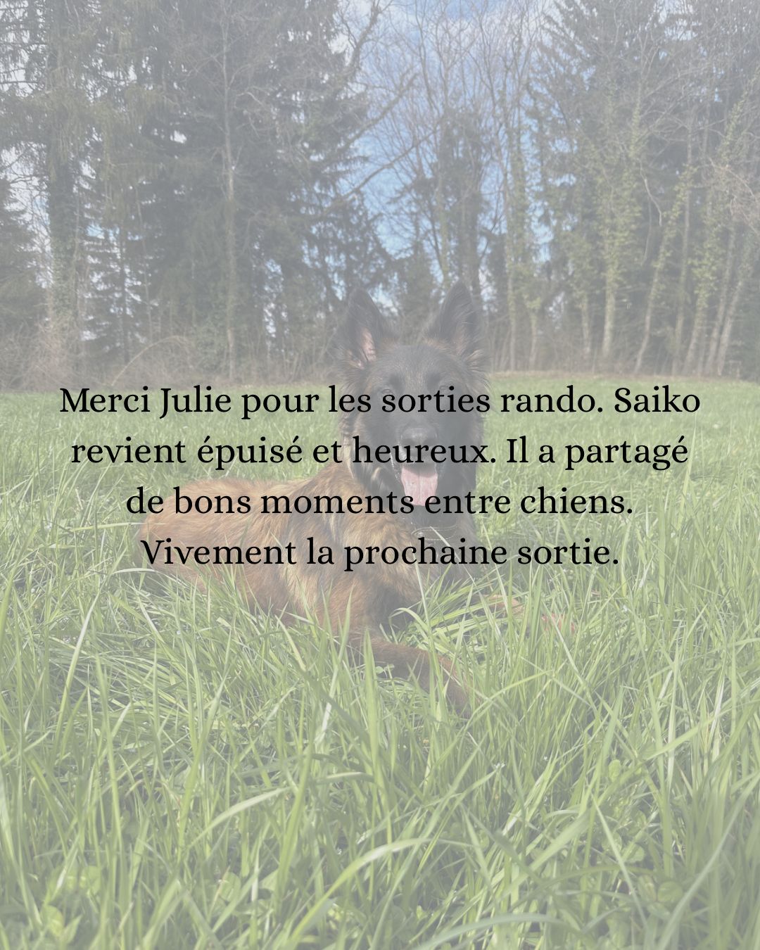 La randonnée dure en moyenne 3 à 5 heures, avec un rythme adapté au groupe. Nous alternons marche active, pauses, exploration, jeux et moments plus calmes. J’observe attentivement les interactions, j’anticipe et je veille à ce que chaque chien évolue sereinement au sein de la meute.
